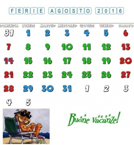 Quest'anno le ferie estive cominceranno lunedì 08/08/2016 e finiranno venerdì 26/08/2016.